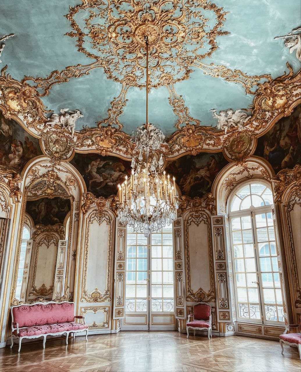 Овальный зал с потолком в бирюзовых тонах считается первым из сохранившихся интерьеров в стиле рококо, что отличается тонкостью и изящностью.
